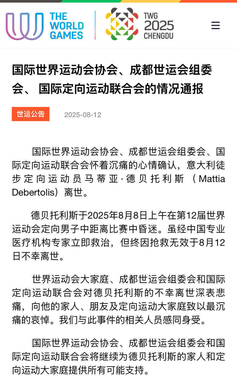 中国青年报客户端成都8月12日电(中青报·中青网记者 梁璇)8月12日,国际世界运动会协会、成都世运会组委会、国际定向运动联合会发布公告称,意大利徒步定向运动员马蒂亚·德贝托利斯(Mattia Debertolis)在成都世运会比赛期间昏迷入院,经抢救无效于8月12日不幸离世,享年29岁。