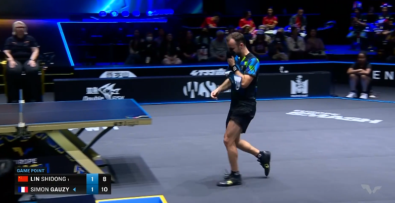 西蒙越战越勇,以10:5拿到第3局比赛的局点!林诗栋并没有放弃一分分追赶,连续挽救了三个局点,将比分追到8:10,此时西蒙被迫叫了暂停!